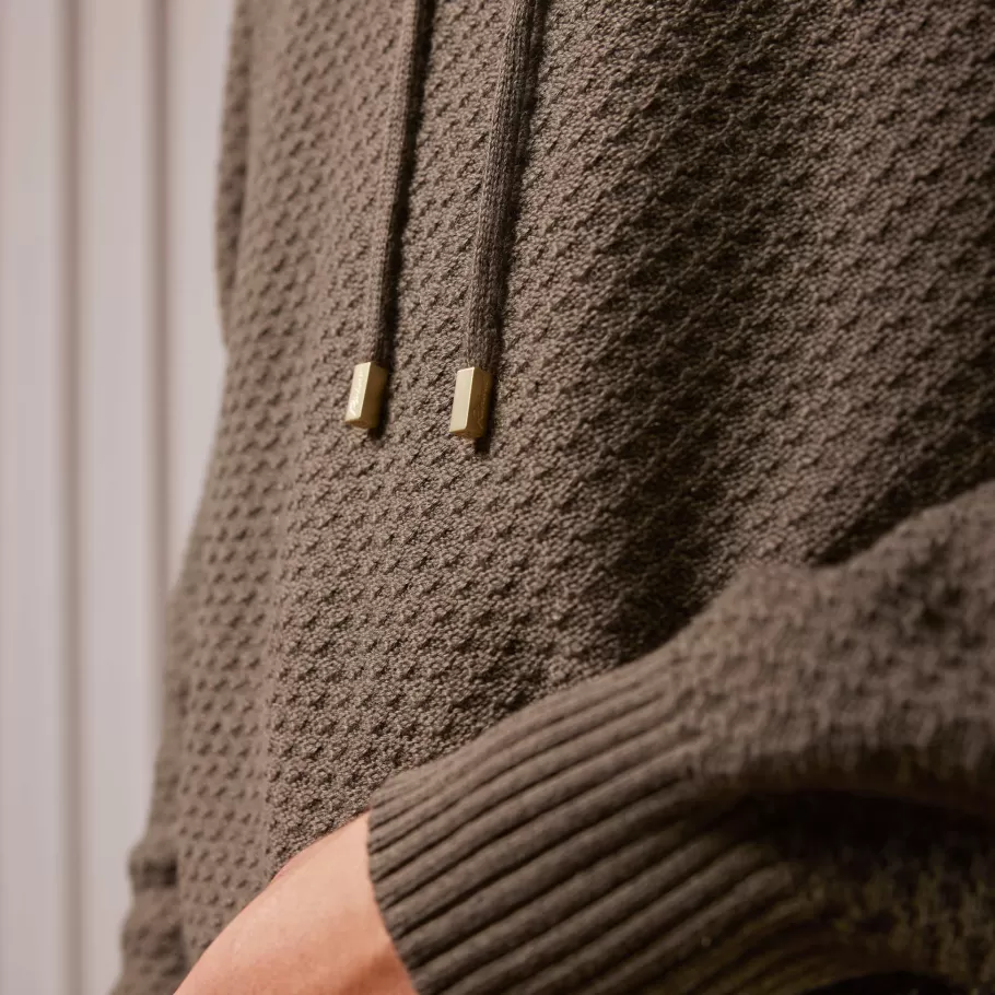 Hooded sweaterFancy diamond-stitch knitColor: KhakiComposition: 90% cotton10% cashmereMade in MoroccoReference : PLFLOR…