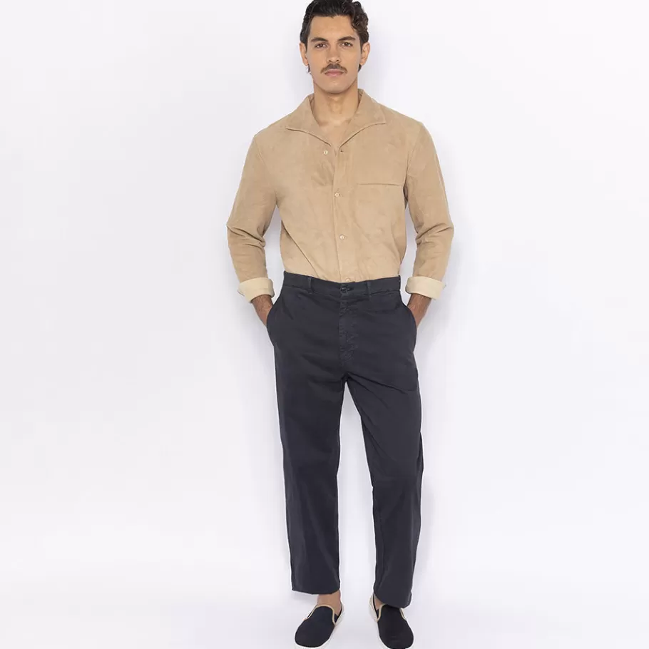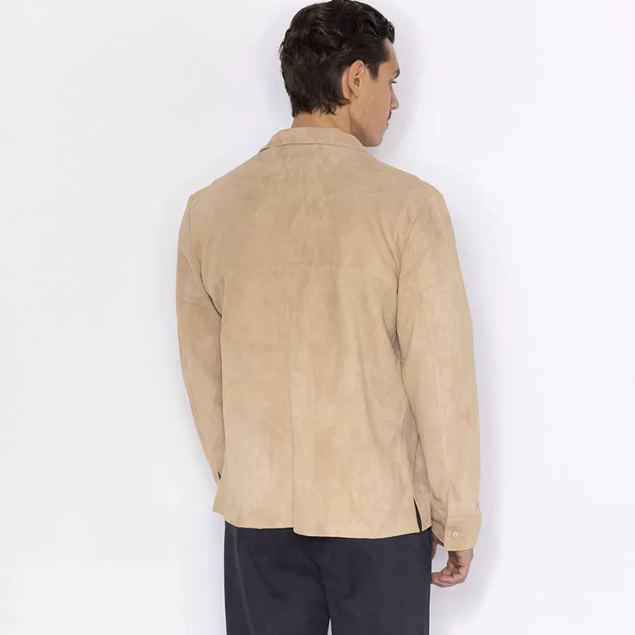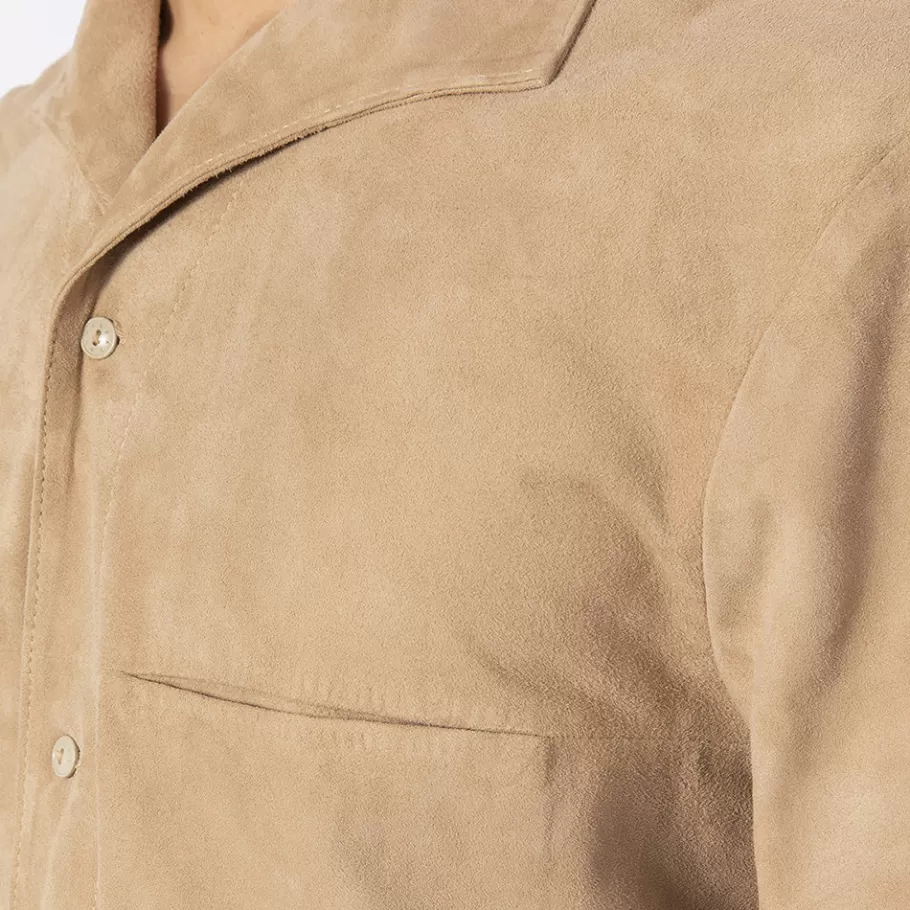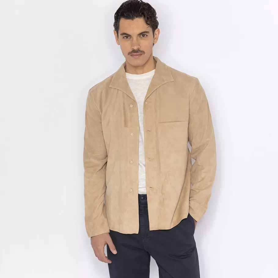 Long-sleeved suede shirt with yoke. Invisible pocket and shark collar