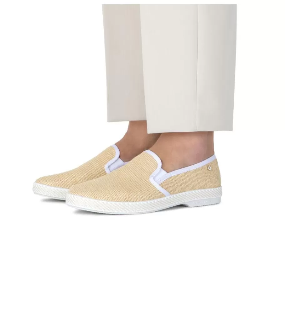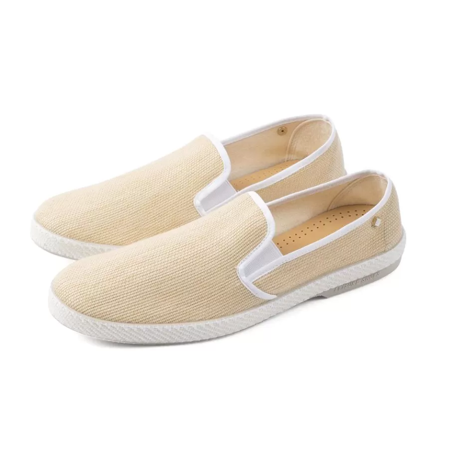 . Raffia. Golden rivet emblem . Grosgrain polyester piped . Cotton lined . Sheepskin inner sole . Gum outsole . Made in …