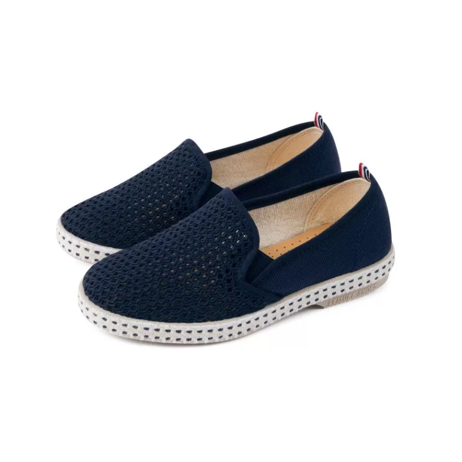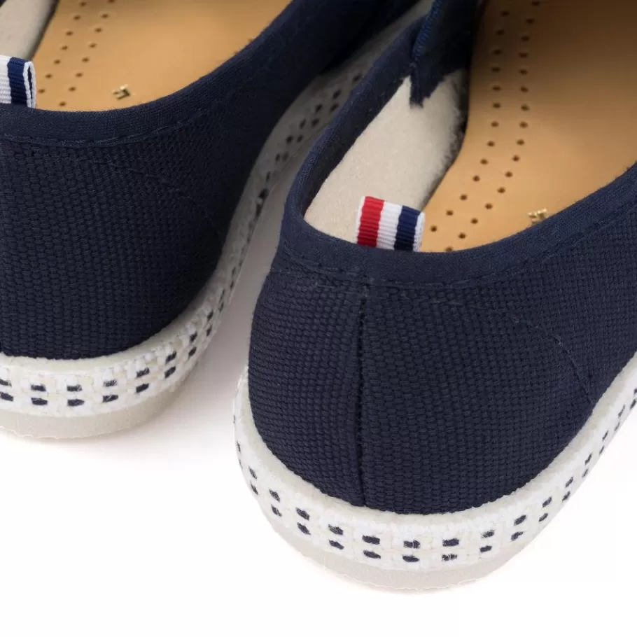 . Cotton canvas & mesh. Blue-White-Red pull-on tab. Cotton piped. Terrycloth lined. Sheepskin inner sole. Gum outsol…
