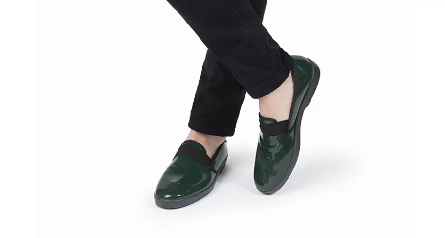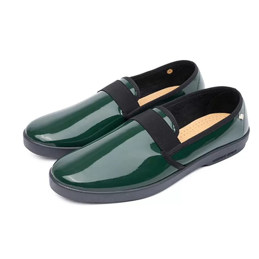 The elastic band is movable from top of the shoe tongue.. Vinyl . Golden rivet emblem . Grosgrain polyester piped . Terr…